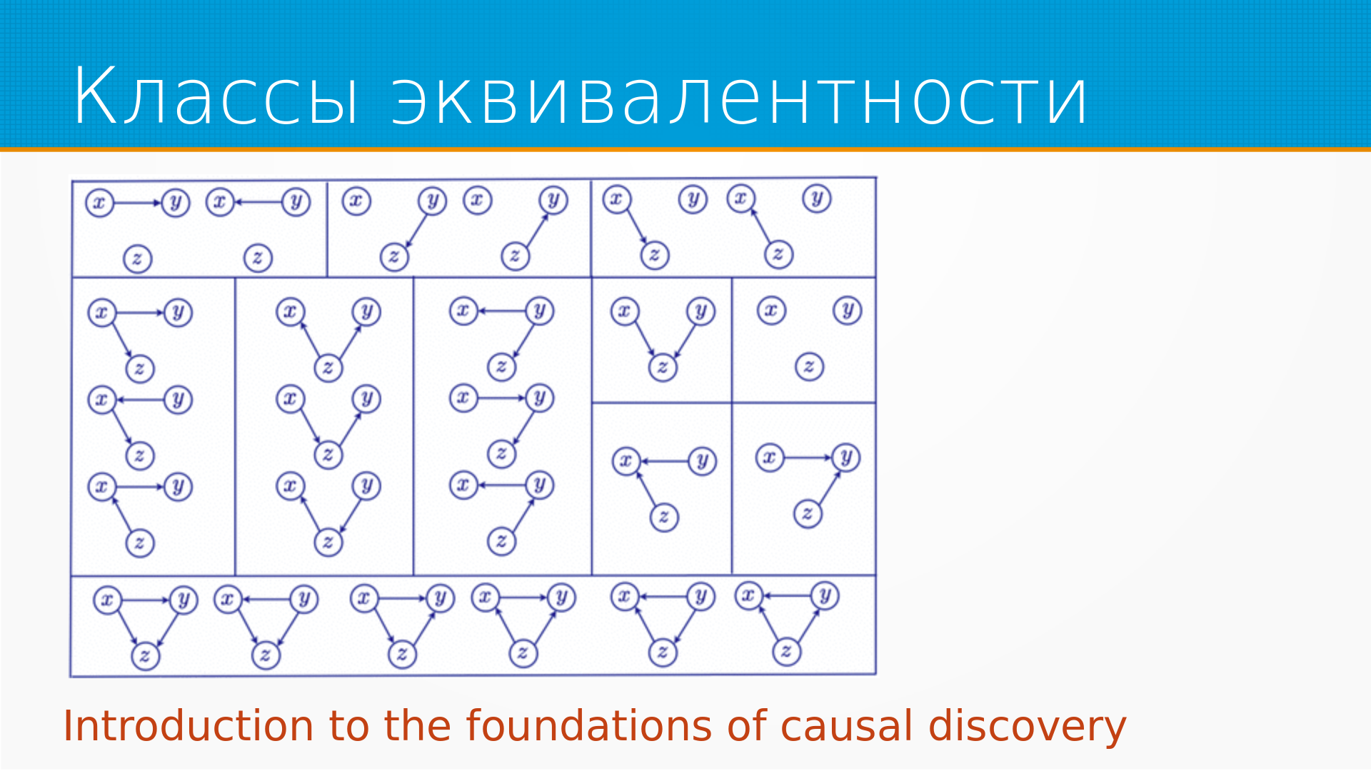 Кстати, про графы - есть классы марковской эквивалентности. С точки зрения причинности все эти комбинации внутри одного блока одинаковы, то есть мы не можем их различить без дополнительной информации.