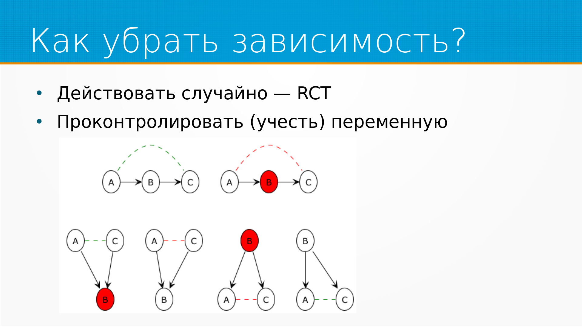 Предположим, что у нас есть А и С, между которыми мы пытаемся выяснить причинно-следственную связь. И оба зависят от Б. Например, опять же - продажи мороженого и количество утопленников - и то и другое зависит от температуры. То есть, когда людям жарко, они ведут себя менее воздержанно, ну и мороженого тоже покупают больше. Таким образом, если мы не знаем, какая температура на улице, то мы можем выявить зависимость между потреблением мороженого и уровнем утопленников. Но если мы точно знаем, какая температура, то такой зависимости нет.