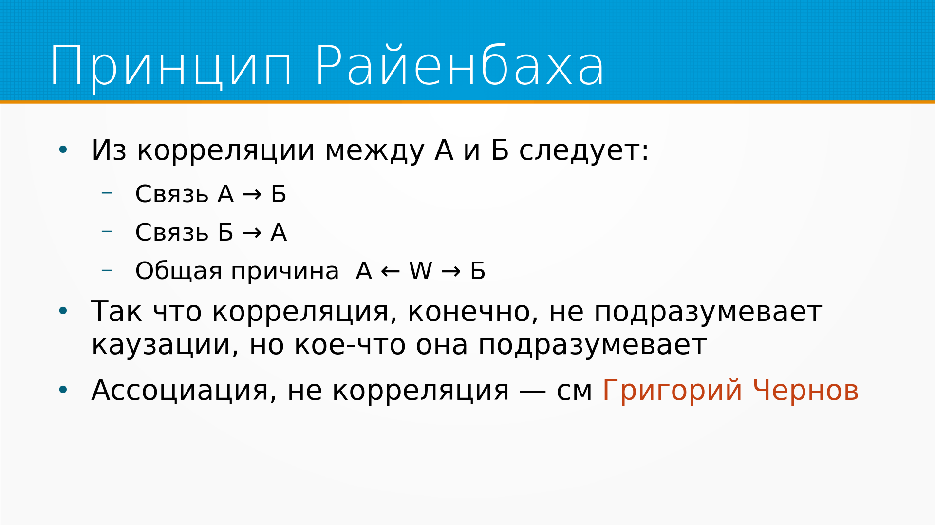 Есть принцип Райенбаха, который говорит, что из корреляции между А и Б следует что-нибудь из трех. Либо А это причина Б, либо Б это причина А, либо у них есть какая-то общая причина С.