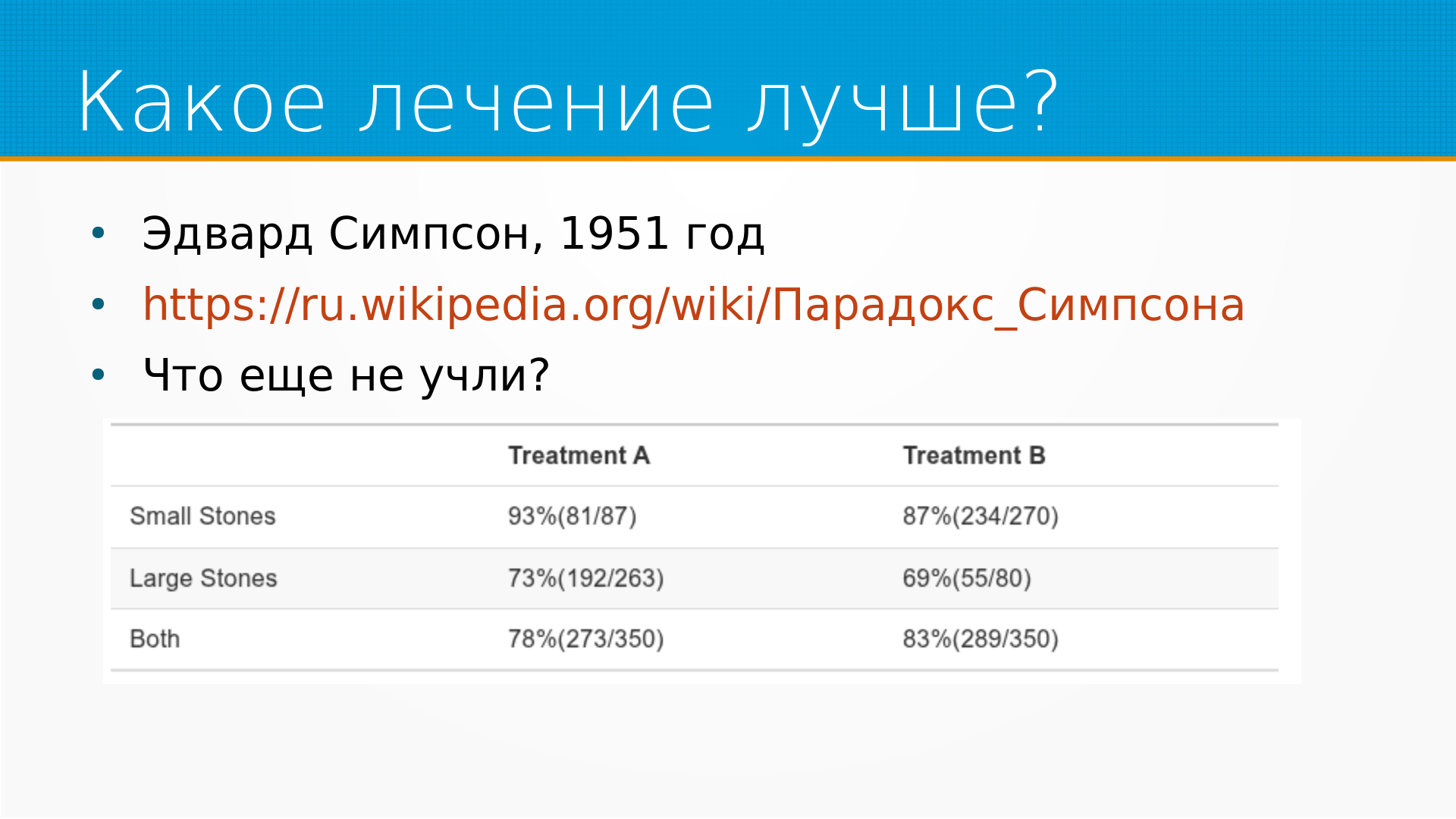 Во-первых, конечно, если мы учтем влияние размера камней, то все встанет на свои места. То есть у нас очень смещенная выборка - грубо говоря, лечение Б получали люди в основном с легкими случаями, а лечение А в основном с тяжелыми случаями. И если мы сделаем поправку на размер камней, то получится, что лечение А, конечно, выгоднее.