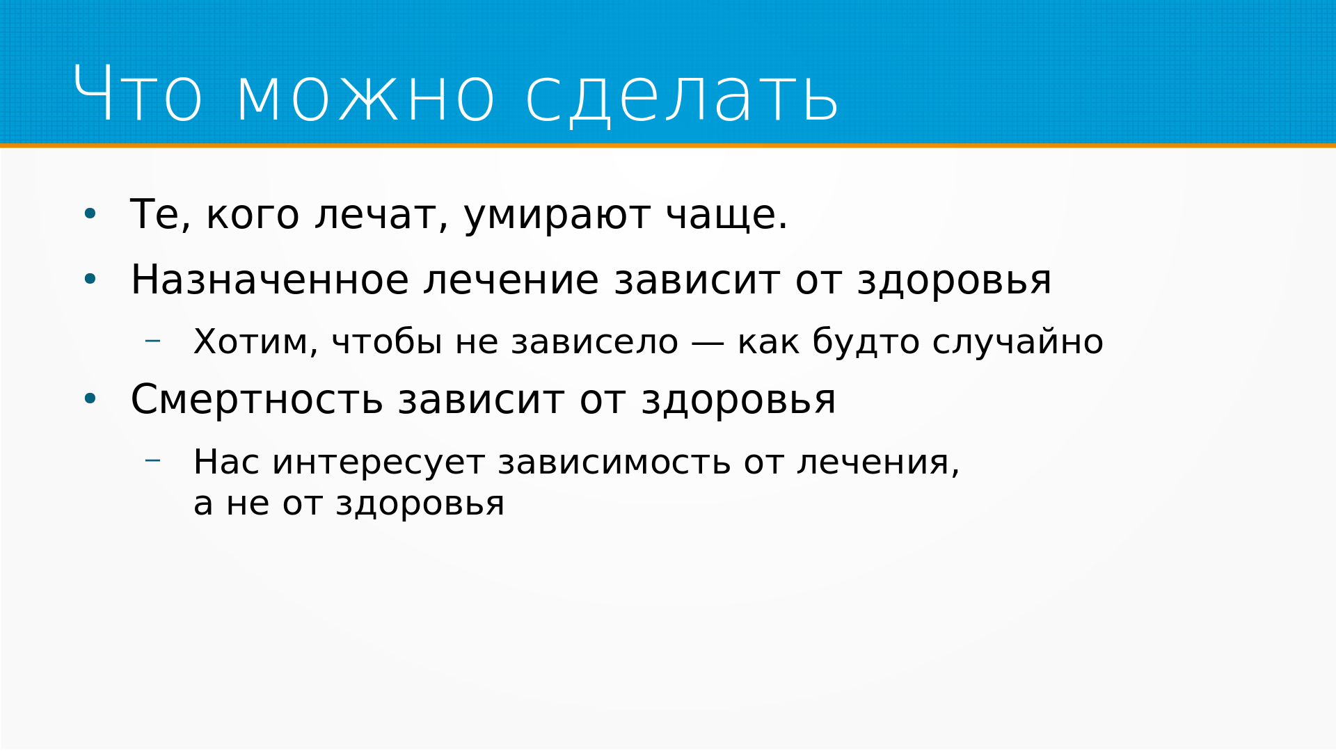 Также смертность зависит от здоровья. Ну, мы хотели бы, чтобы смертность зависела от лечения, а не от здоровья - но смерть придет и заберет вне зависимости от нашего желания по этому поводу.