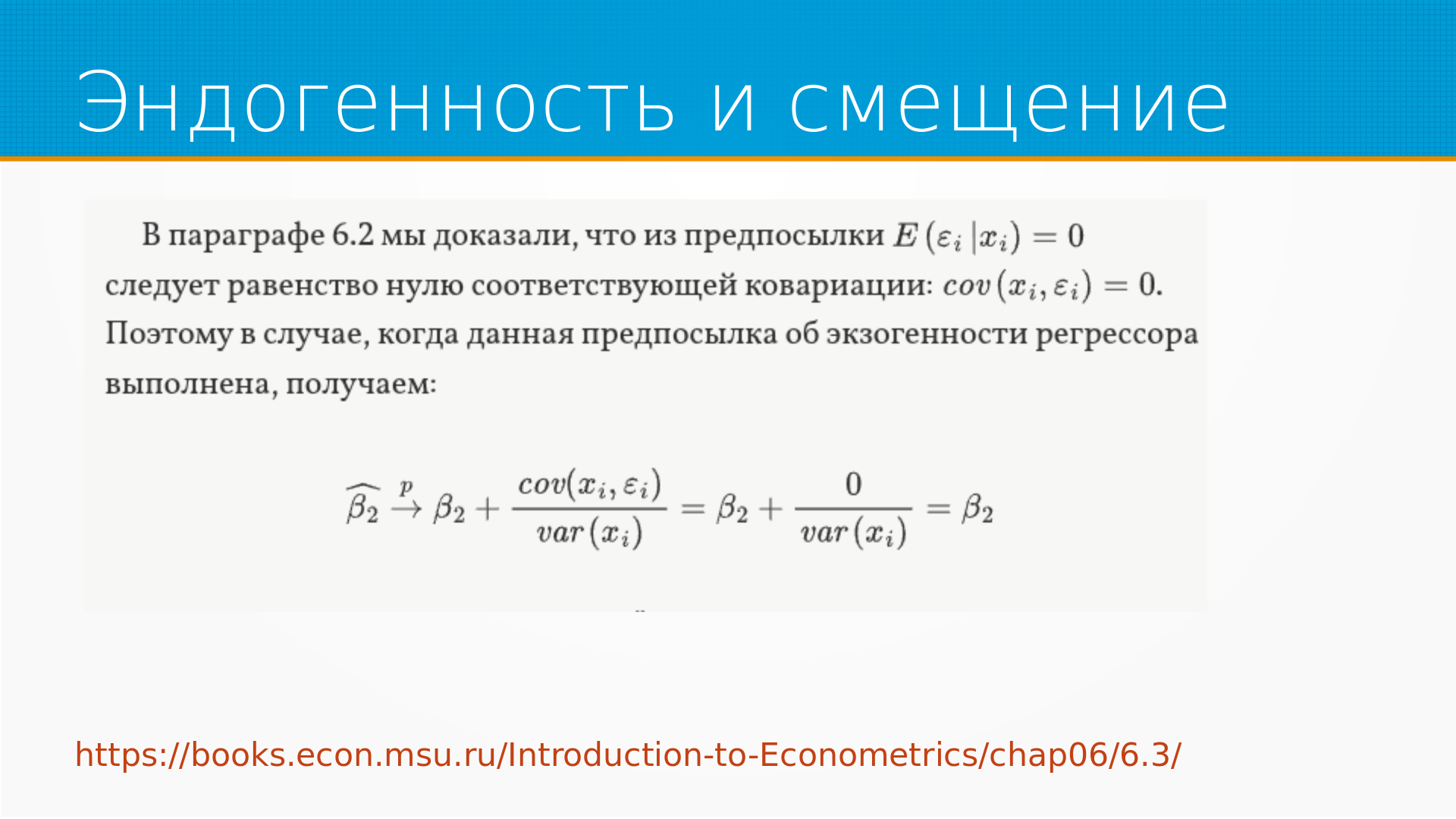 Это из книги «Дружелюбная эконометрика», там это немножко строже показывается, но что тут хотелось бы сказать - что если у нас есть некоторый кофаундер и его ковариация с нашими регрессионными остатками не нулевая, то он вносит смещение.