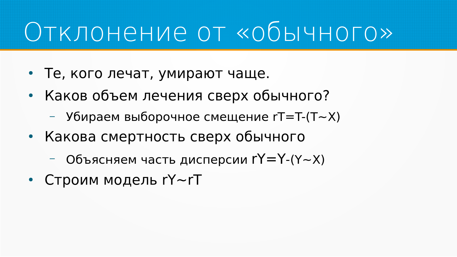 И вот тут мы можем скорректировать нашу картину мира. То есть мы можем посмотреть не на то, каков был объем лечения, а каков был объем лечения сверх обычного в таких обстоятельствах. Тем самым мы выявим ситуации, когда лечили, когда не принято лечить и не лечили, когда принято лечить.