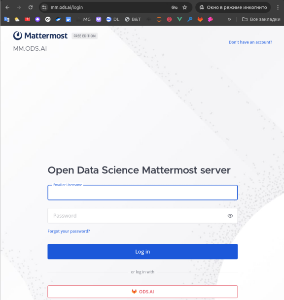 Просто сервер mattermost, на который может зайти любой, имеющий аккаунт на ods.ai. Авторизация сделана через OAuth, на бесплатной версии mattermost это работает только через Gitlab. Поэтому мы подняли сервер авторизации, который притворяется Gitlab сервером, а сам берет доступы с сайта ods.ai. Это объясняет, почему авторизация на сервере такая кривая ;-)