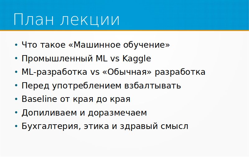 Про что я хочу сегодня рассказать? Во-первых, про то, что такое, собственно, машинное обучение, как его понимаю, полезный способ думать про машинное обучение. Второе, чем промышленное машинное обучение отличается от Kaggle. Там есть важное отличие, и о нем надо немножко по-другому думать. Чем ML-разработка отличается от обычной разработки, потому что все чаще приходят к выводу, что ML – это не какой-нибудь особый вид животных, а просто та же самая разработка программного обеспечения, только со своим библиотеками. Но вот нет. Есть свои важные отличия, я про них расскажу.