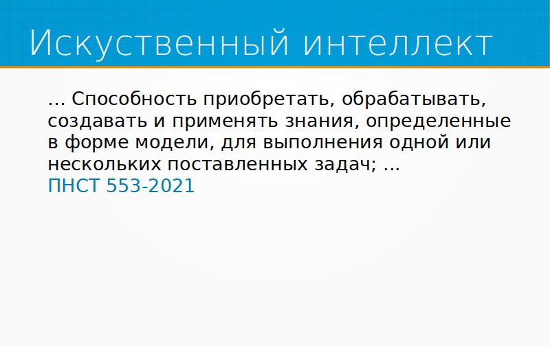У нас есть национальный проект национального стандарта в России на искусственный интеллект, и там написано буквально следующее, что искусственный интеллект – это нечто, обладающее способностью приобретать, обрабатывать, создавать применять знания в определенной форме модели для выполнения одной или нескольких поставленных задач. Что интересно, под эту формулировку попадает, например, любой студент или код, или калькулятор. Эта формулировка не говорит просто ничего, она бесполезна для практики, но, в общем, красиво выглядит.
