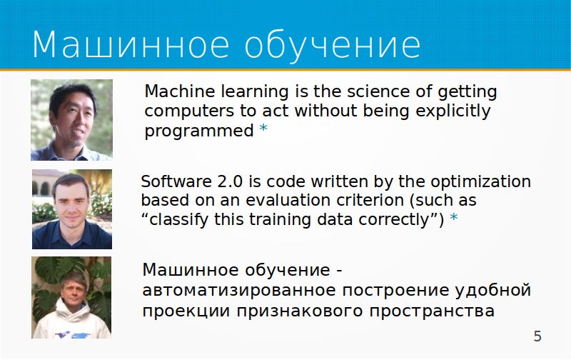 Андрей Карпатый, если кто не знает, он глава AI в Tesla, называл машинное обучение программным обеспечением 2.0, это когда код вместо человека пишет оптимизационный алгоритм, основываясь на некоторых критериях.