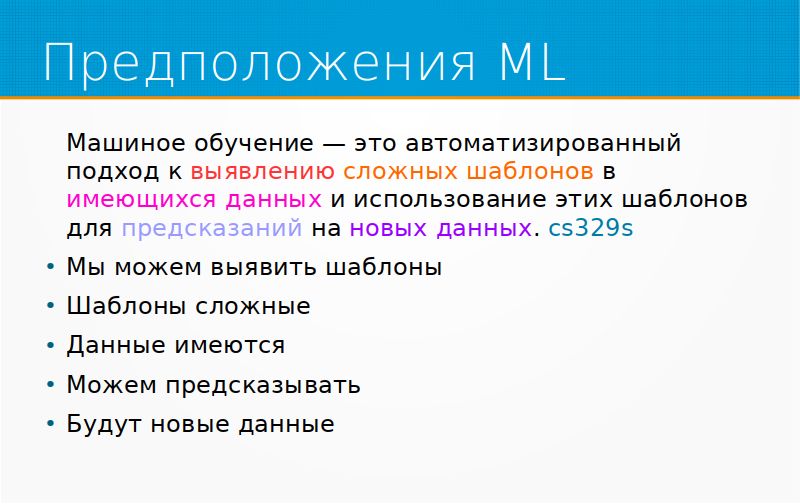 Для меня машинное обучение – это все-таки автоматизированное построение удобной проекции признакового пространства. Но это все какие-то такие оторванные от жизни слова. Мне нравится определение машинного обучения в Стэнфордском курсе Computer Science 329: машинное обучение – это автоматизированный подход к выявлению сложных шаблонов в имеющихся данных и использование этих шаблонов для предсказания о новых данных. Тут важны выделенные цветом слова. Во-первых, мы можем выявить шаблоны. Не всегда шаблоны мы можем выявить. Например, очень многие люди пытались предсказывать генераторы случайных чисел. Иногда это даже работает, тогда, когда эти генераторы чисел не случайны, то есть если в них есть шаблон. У нас изначально есть предположение, что в том наборе данных, который мы исследуем, моделируем, там есть шаблоны, и мы примерно предполагаем, какие.
