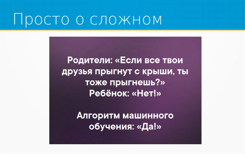 Ну так вот, про машинное обучение. На этом слайде все про него рассказано, если кратко. Машинное обучение ищет шаблоны в данных, и в соответствии с этими шаблонами делает предсказания. Соответственно, если в данных все прыгали с крыши, то и машинное обучение с крыши прыгнет, вы никуда от этого не денетесь. Опять же, я повторюсь, что я говорю о машинном обучении в бизнесе. В науке, в соревнованиях все может быть по-другому. В бизнесе машинное обучение – это вот так.