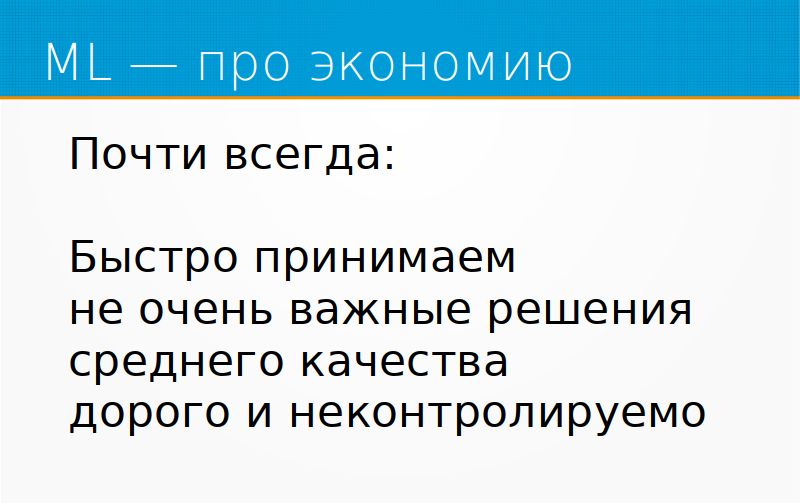 Затем, машинное обучение – это почти всегда про экономию, то есть не про совершенство, не про скорость, не про выявление каких-то сложных вещей, которые не видны глазу, а просто про то, чтобы тратить меньше денег на принятие решений. Мы быстро принимаем не очень важное решение среднего качества дорого и неконтролируемо. Из этого, собственно, проистекает область применения. Например, когда люди используют машинное обучение, чтобы остановить конвейер, который печатает этикетки, это хорошее применение, потому что тут не очень важное решение среднего качества, его надо быстро принять. А если же вы, допустим, используете машинное обучение для, например, принятия судебных решений, это спорная вещь, потому что это важное решение, хотелось бы чтобы оно было качественное, последствия его велики. В общем, машинное обучение – это про экономию. Это не про качество, не про магию, это про экономию денег и времени.