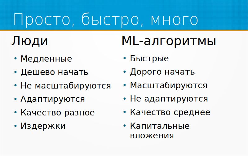 Машинное обучение – это про «просто, быстро и много». Люди медленные, ML-алгоритмы быстрые. Тупые, но быстрые. С людьми дешево начать проект. Вы можете взять человека, на пальцах ему объяснить, что от него требуется, он начнет как-то работать. С ML-алгоритмами начать обычно дорого. Люди, однако же, не масштабируются. Если вам внезапно понадобилось в 10 раз больше делать предсказаний человеком, вам этого человека придется учить.