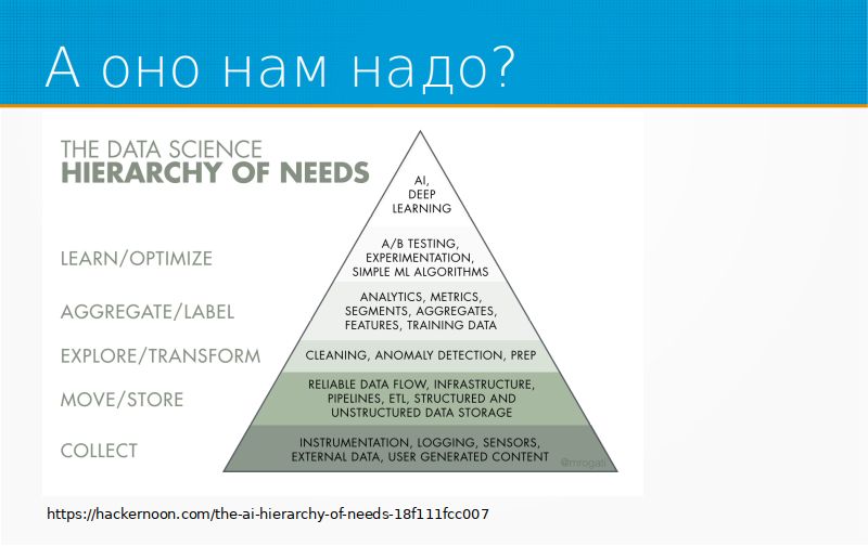 Про то, как машинное обучение внедряется в предприятия. Хорошая диаграмма, иерархия потребностей в искусственном интеллекте. Она как раз описывает главные этапы, через которые проходит бизнес, прежде чем у него появляются интересные модельки Machine Learning. Сначала, прежде чем данные анализировать, их надо собирать, потом их надо научиться складывать, обрабатывать, и только после того, как мы их научились собирать, складывать и обрабатывать, мы можем делать в них что-нибудь очень простое, например, детекцию аномалий. Мы внедрили детекцию аномалий, можно внедрять какие-нибудь метрик, аналитику, можно А/В-тестирование, можно внедрять простые ML-алгоритмы. И только после того, как все это счастье у нас уже есть, имеет смысл доставать модели машинного обучения и делать что-то сложное. Иначе вы будете пытаться решить проблему, которой еще нет.