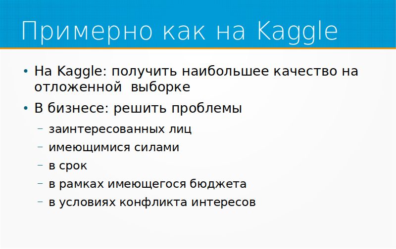 Я думаю, что Kaggle – это хорошая техническая школа. Как мне говорили люди, которые в нем участвовали, со мной участвовали, что «мы тут за месяц узнаем больше, чем за полгода в реальной работе». Kaggle – это очень хорошо, просто надо не путать соревнования и... Грубо говоря, не надо путать секцию каратэ драку на улице, в жизни все сложнее.