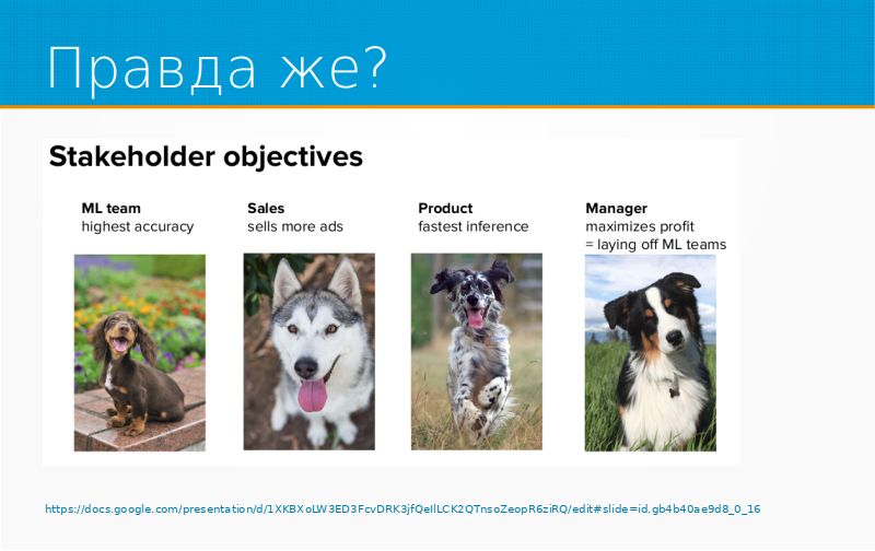 Когда я говорил про конфликт интересов, вот хороший слайд. В принципе, может быть, для какого-то из менеджеров, который владеет этим процессом, самый простой способ максимизировать прибыль – это просто уволить ML-команду и получить премию. Такое тоже может. Допустим, сисопы, то есть люди, занимающиеся непосредственно поддержкой системы на проде, они не любят эмэльщиков просто потому, что те в их быструю систему, которая может обрабатывать десятки тысяч, сотни тысяч запросов в секунду, приносят что-то тормозное, которое отвечает через полсекунды, например. Ваша ML-модель с высокой производительностью может противоречить интересам тех людей, для которых вы работаете.
