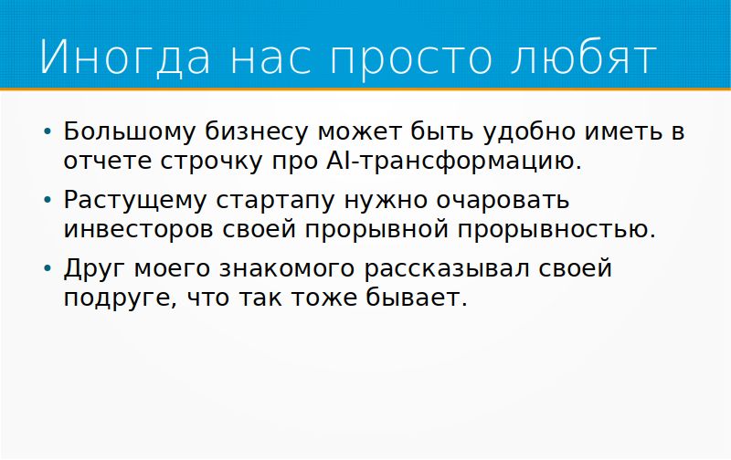 Иногда бывают другие примеры. У некоторых организаций просто стоит галочка, им нужно поставить галочку, что они внедрили машинное обучение. Особенно это зарубежные заказчики таким знамениты, и у нас отечественные, по-моему, тоже могут. «Пусть оно работает так же, как человек, но зато все наши инвесторы знают, что у нас прошла AI-трансформация».