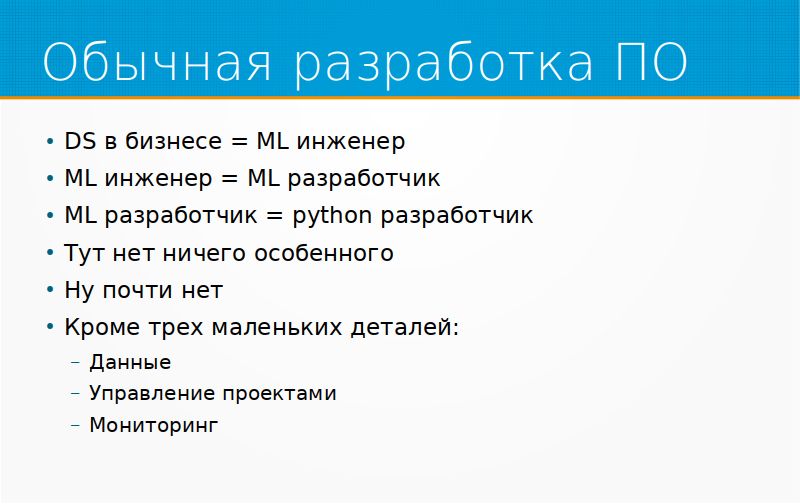 В принципе, разработка ML-проектов очень похожа на просто разработку программного обеспечения. Человек приходит делать Data Science и обнаруживает в себе Python-разработчика. В принципе, это действительно просто разработка со специальными библиотеками, кроме трех небольших особенностей.