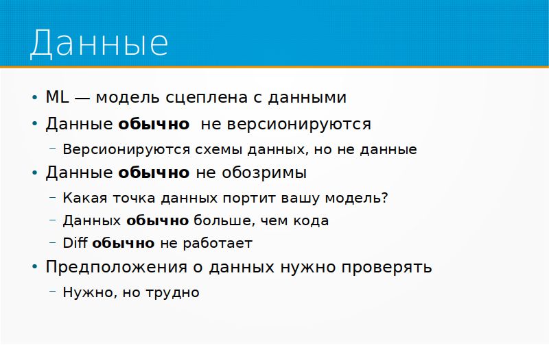 Про данные. Вся инженерия программного обеспечения строилась вокруг того факта, что некоторые вещи должны быть вместе, некоторые вещи должен быть раздельно, это про сцепление вещей, что вот это мы инкапсулируем, прячем зависимости, и так далее, и тому подобное, объектно-ориентированное программирование вокруг этого построено и так далее. А тут у нас есть ML, и модель жестко сцеплена с данными. Модель – это у вас не просто код, а она бесполезна без тех данных, которые в нее поступают.