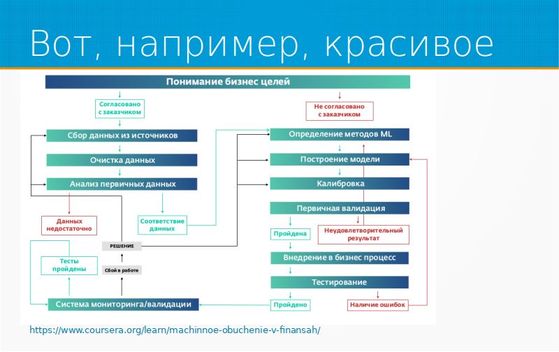 У «Сбербанка» есть хороший курс «Машинное обучение в финансах», и там они разбирают подход, который принят у них. Все начинается с понимания бизнес-целей, то есть что, собственно, мы хотим достичь. После того, как мы договорились, мы заботимся о данных, есть ли у нас данные. Потом мы пытаемся понять, как мы будем учить, валидируемся, внедряем, мониторим, и если что-нибудь не то с мониторингом, мы снова собираем данные и так далее. Это как раз вот эти главные блоки, особенности управления, особенности сбора данных и мониторинг.