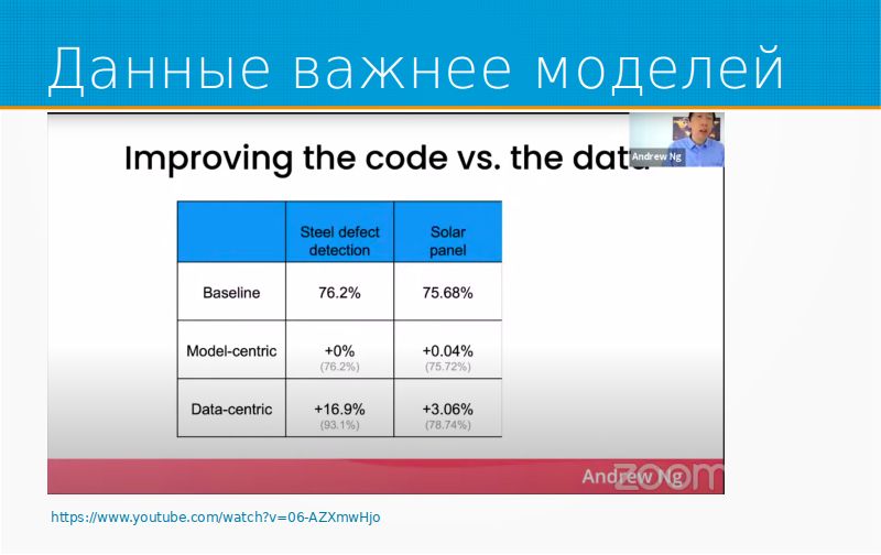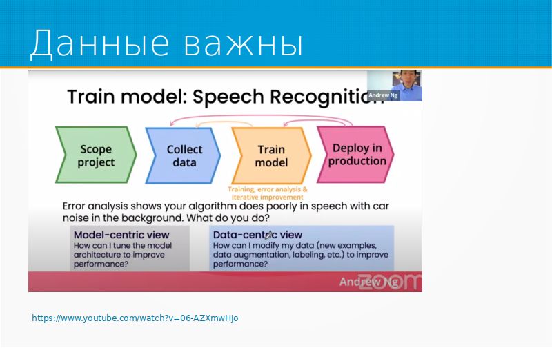 Данные очень важны. Например, есть такое программное видео Andrew Ng, он давал вебинар на тему Data-centric AI, и там он разбирал ситуацию. например, у вас есть проблема с вашим алгоритмом распознавания команд внутри машины, он не слышит, что сказал пользователь, и что вы будете делать? Либо вы будете улучшать модель, либо вы будете больше собирать данных. Как-то очистить данные, улучшить данные, найти и выкинуть выбросы, аугментировать их как-то лучше. Он утверждал, что на основании его опыта, который гораздо больше моего, Data-centric-подходы всегда побеждают Model-centric. Грубо говоря, если у вас осталось два месяца, а проект все еще не взлетел, потратьте их на данные, а не на модель. Я немножко утрирую, но, в общем, ссылка на слайдах есть, можно посмотреть.