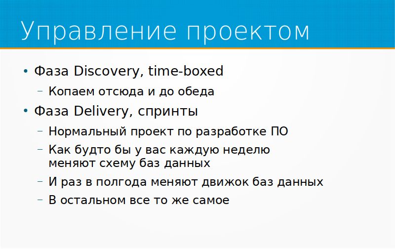 Что касается управления проектом, чем отличается управление проектом по разработке программного обеспечения от проекта по созданию ML-продукта какого-то, ML-сервиса? Прежде всего, тем, что там есть очень большая неопределенность, что же мы такое строим, возможно ли оно. Поэтому один из работающих подходов – это делить проект на две фазы: фаза Discovery и фаза Delivery. Discovery – это ограниченная по времени активность типа «давайте мы поиграем в песочнице, вот у вас есть месяц, и целый месяц мы пробуем эксперименты, строим модельки, рисуем ноутбучики, пытаемся понять, что возможно, какие есть проблемы, какие есть решения и так далее». У вас в плане проекта вот так и написано, типа «месяц, играем». Через месяц мы выявляем, если нам повезло, проблемы убеждаемся, что все доступно, что данные как таковые есть, что, в принципе, подходы, возможно, работают, и тогда можно идти тем же самым способом, как устроена обычная разработка программного обеспечения, то есть со спринтами, короткие спринты по неделе-две, выбрали список задач, сделали, посмотрели, что получилось. С маленькой особенностью. Если кто-то разрабатывал программное обеспечение, представьте себе, что у вас каждую неделю меняется схема баз данных, и раз в полгода вы меняете движок анных, мигрируете с MySQL, допустим, на SQL-сервер, потом с SQL-сервера мигрируете на Postgres, и так по кругу. У вас все время проблемы с данными. Но в остальном примерно такое же управление проектами, как и в любом другом программном обеспечении.