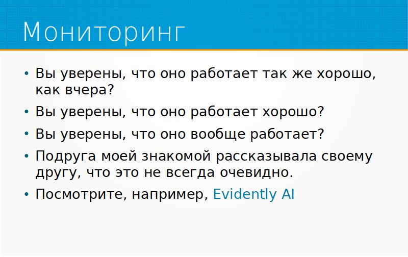 Мониторинг очень важен, и тут, наверное, вместо того, чтобы рассказывать про это, я ссылку на Evidently AI добавлю, там хороший опенсорсный продукт для мониторинга моделей и очень-очень много статей с рассказами, почему это важно, и какие обычно ошибки случаются на этом пути.