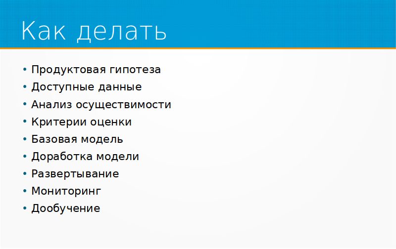 Как я думаю, что надо подходить к разработке ML-проектов? Понятно, что все начинается с продуктовых гипотез, и мы предполагаем, что если мы, например, построим систему, которая предсказывает следующий переход на странице пользователя, то мы сможем как-то улучшить продажи в нашем Интернет-магазине. Тут хорошо бы эту модель провалидировать, потому что самый хороший вопрос – это «и что?». Вы приходите и говорите: «Я могу предсказать, какой будет следующий переход пользователя на сайте». Вам говорят: «И что?» «Ну, как? Вы же можете знать, какой товар его заинтересует». Вам говорят: «Так он все равно же туда перейдет, зачем нам это предсказание?» Много вещей, которые можно предсказать, совершенно бесполезны для бизнеса.
