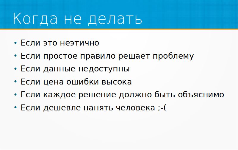 Потом, очень часто простое правило решает проблему. Есть мнение, что если вы считаете, что вам ML-модель, допустим, даст прирост производительности на 100%, то простое правило 50% из этого прироста тоже сможет дать. Часто данные недоступны, и тогда просто надо отправить людей собирать данные, и не мучиться. Если цена ошибки высока, возможно, это дело не для ML-модели, как, например, судебные ошибки. Если каждое решение должно быть объяснимо, возможно, что ML-модель тут не нужна. Возможно, что она может просто помогать человеку, но принимать решение все равно должен он. Очень часто дешевле иметь человека, чем сажать ML-модель. Очень жаль, что это так, но на самом деле так.