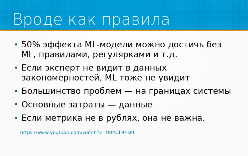 Если бы здесь было одно правило, я бы сказал, что это правило большого пальца, но тут пять правил, поэтому это просто правила. 50% эффекта ML-модели можно достичь без ML – правилами, регулярками и так далее, часто это так.