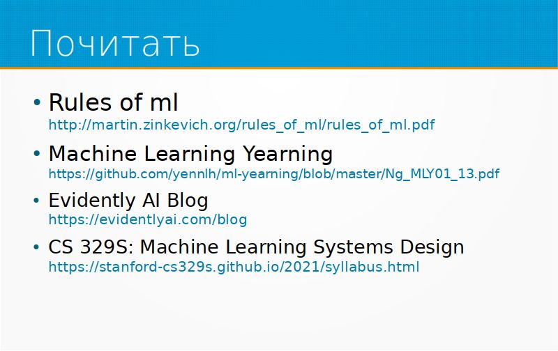 Есть несколько хороших ссылок на «почитать». Первая – это старая книга «Правила ML» гугловская. Ей много лет, но там все правда. Второе – это Machine Learning Yearning. Andrew Ng издавал одно время главами свою книгу, где рассказывал, какие проблемы в машинном обучении он встречал на практике, и какие бы советы он дал человеку, который взялся за это. Evidently AI Blog, про мониторинг, и прекрасный стэнфордский курс. Сам курс, конечно, закрытый, видео у него нет, но есть их презентации и записи лекций, в смысле, конспекты. В принципе, про построение практически полезных систем машинного обучения там очень хорошо и много рассказано.