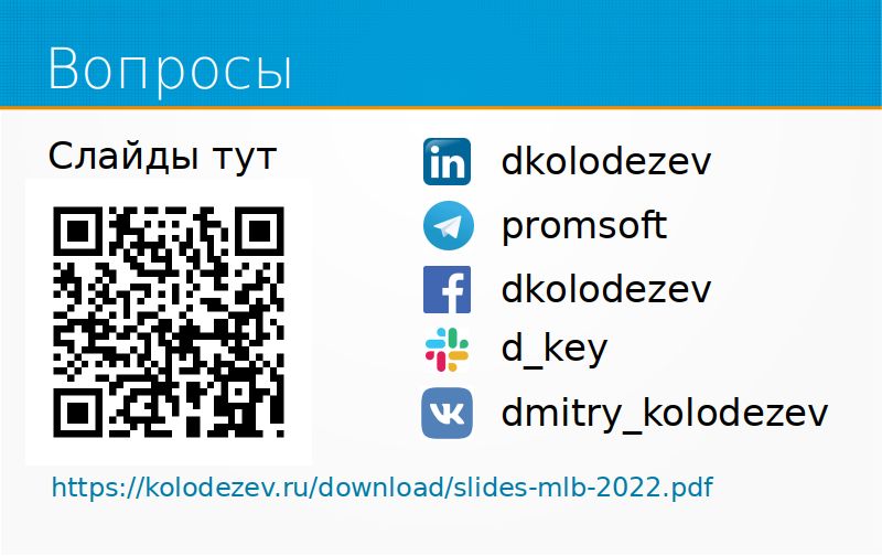 Ведущий: Да, спасибо большое за такую интересную лекцию. Вопросов в YouTube я сейчас не вижу, но у меня у самого есть вопрос. Дмитрий Колодезев: У меня сейчас, секунду, есть из Telegram пара вопросов. А, нет, из Telegram вопросы не сюда. Давайте ваш. Ведущий: Вы затрагивали тему соревнованний по Kaggle. Для человека, который уже в индустрии, насколько полезно заниматься соревнованиями, по вашему мнению?