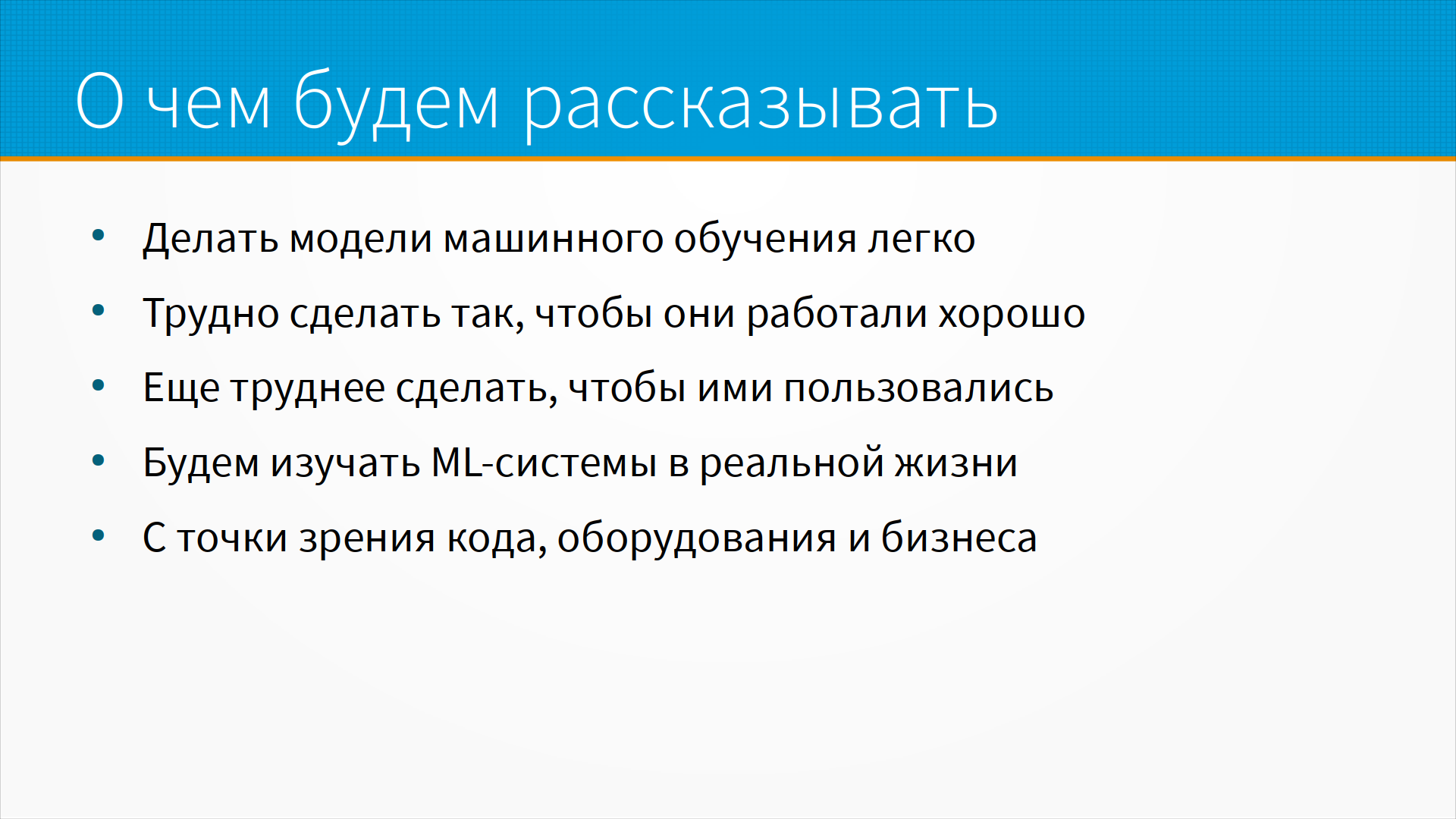 Еще труднее сделать, чтобы ими пользовались. Мы будем изучать ML-системы в реальной жизни - в бизнесе, в производстве,