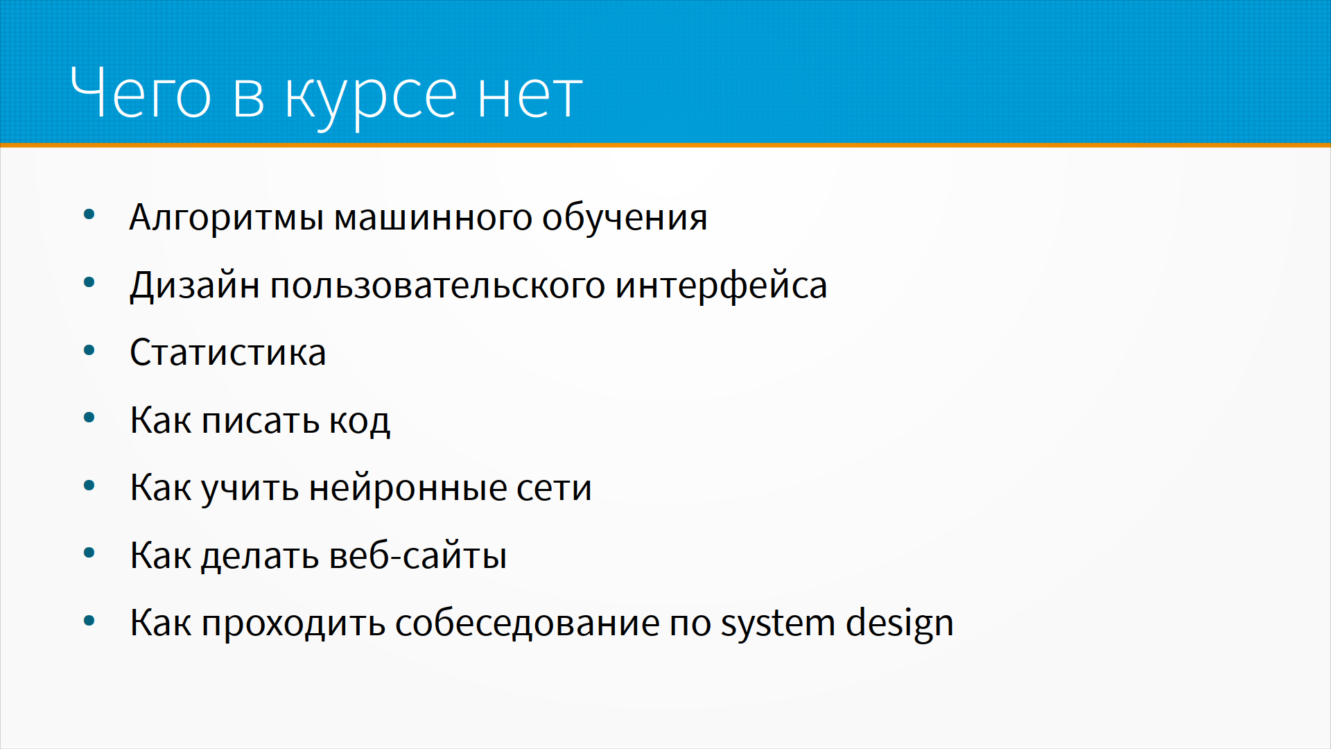 Чего в этом курсе нет: в этом курсе нет рассказов про алгоритмы машинного обучения. На самом деле немножко про алгоритмы