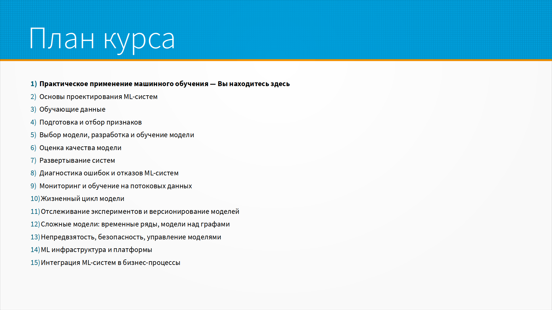 15 лекций примерно соответствуют 15-ти лекциям стэнфордского курса CS329, но тут есть некоторые вольности. Список тем на экране. В двух первых лекциях мы разберем проблемы, возникающие при дизайне ML-систем, а в остальных 13-ти лекциях обсудим решения.
