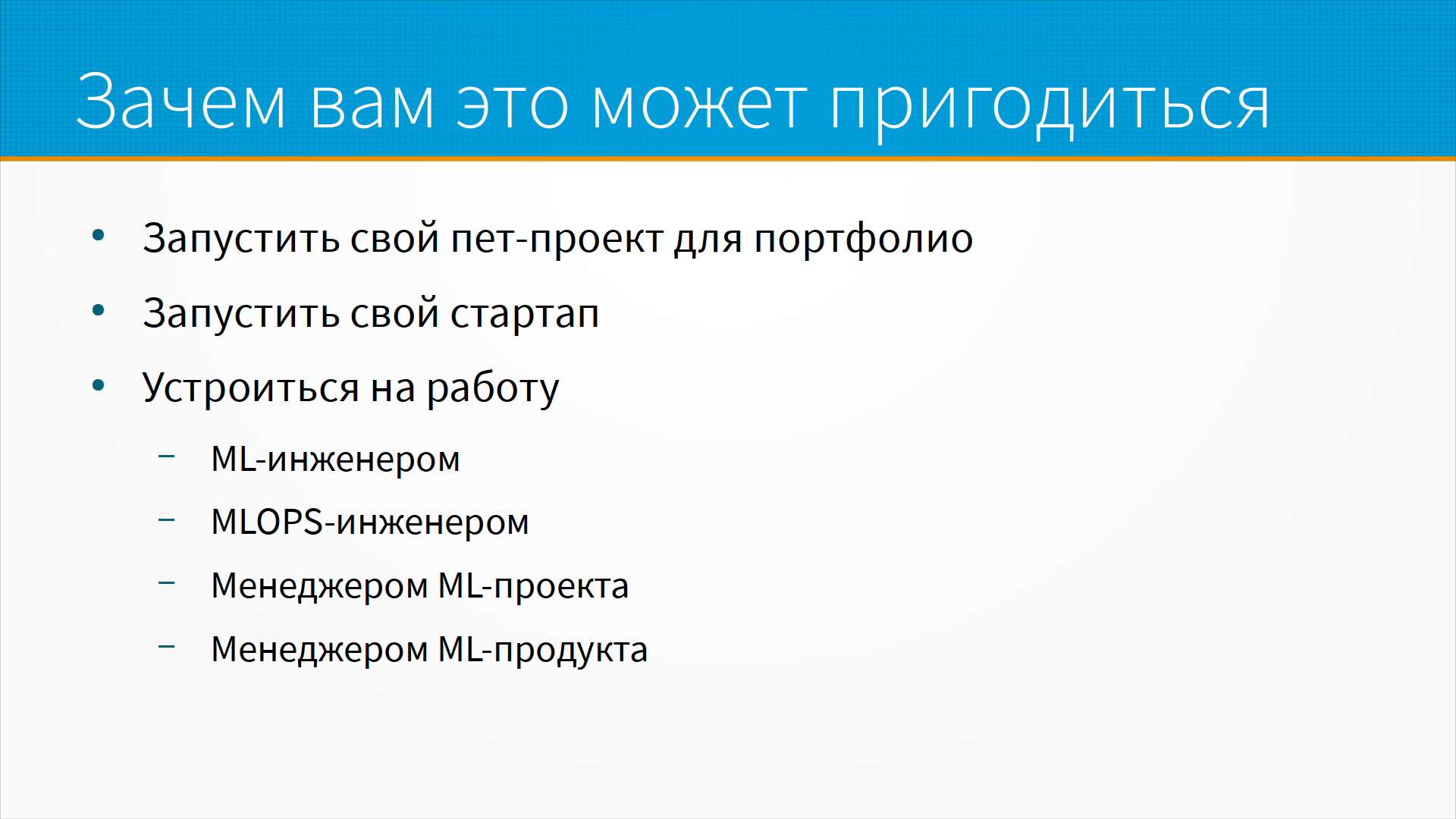 Я думаю, что этот курс будет полезен будущим менеджерам ML-проекта или ML-продукта для того, чтобы понять, как устроен мир - чтобы они понимали основные подходы и ограничения при дотаскивании ML-систем до прода.