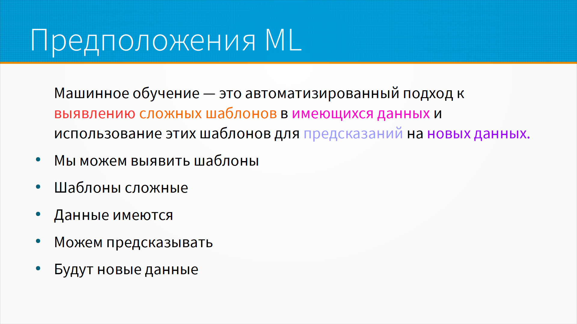 Разберем это утверждение по частям. Мы делаем предположение, что мы можем выявить шаблоны в данных (а это не всегда возможно).