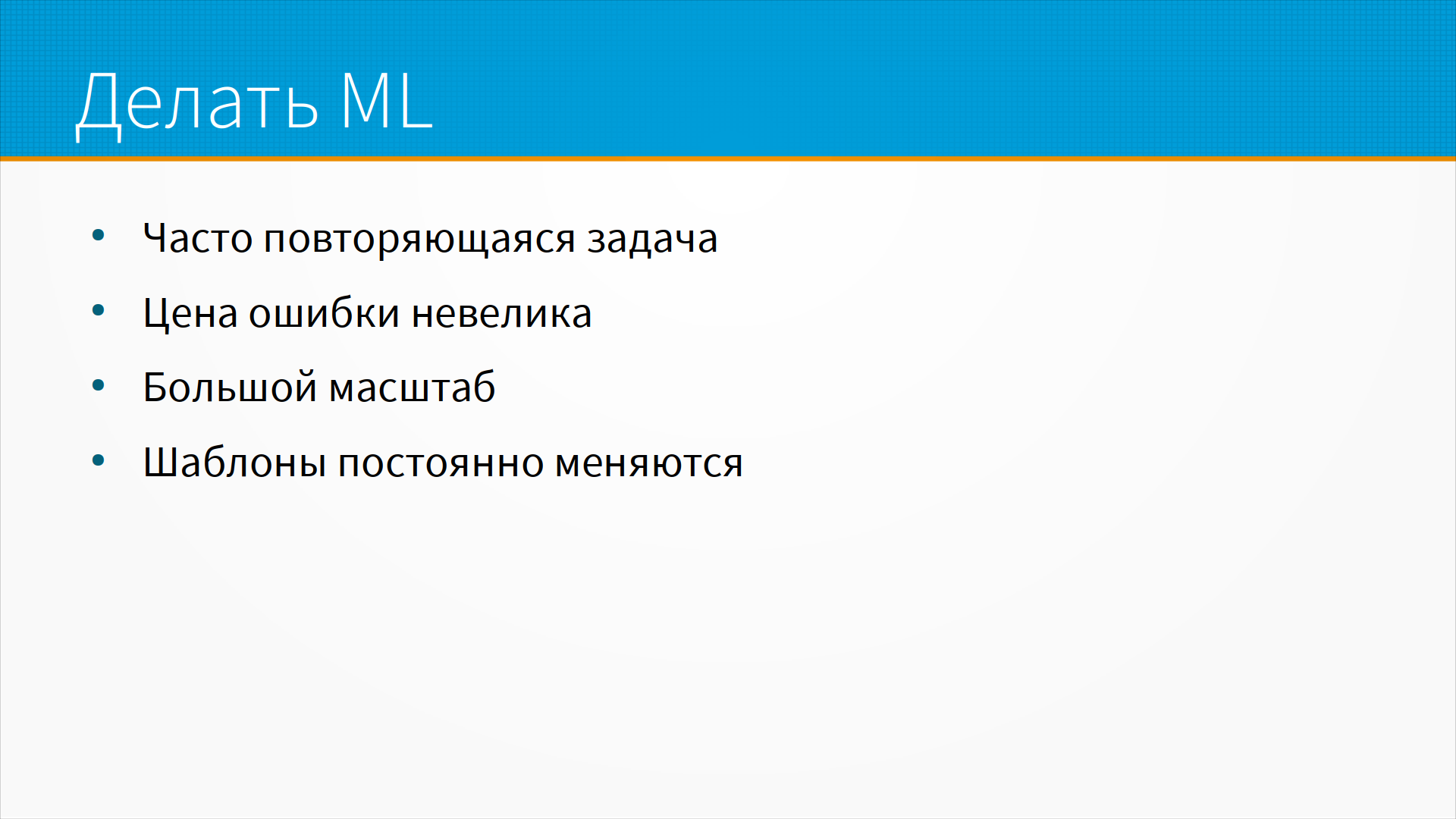 Хорошие условия для использования машинного обучения - часто повторяющаяся задача, малая цена ошибки, большой масштаб, постоянно меняющиеся шаблоны.
