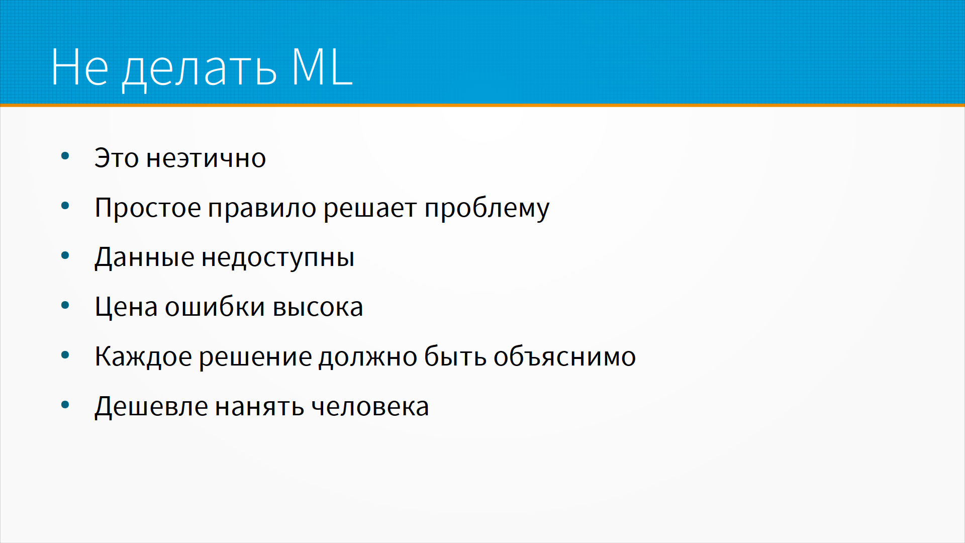 Еще не следует делать ML-систему только ради ML, когда простое правило решает задачу. Таких примеров масса.