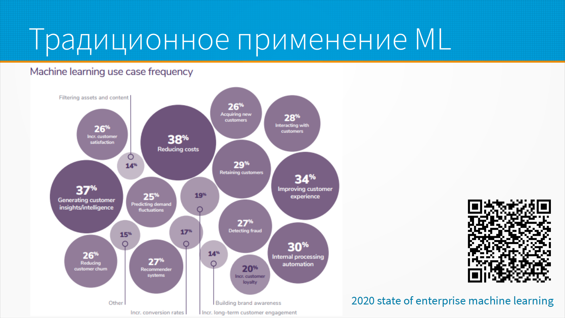 Что мы тут видим: большая часть ML-моделей - про привлечение и удержание клиентов и про снижение затрат на их обслуживание.
