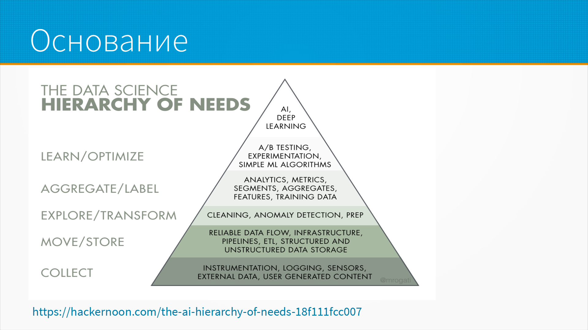 Стартапы обычно пробуют построить пирамиду с вершины вниз. Большие бизнесы вынуждены делать все по порядку. Ваша ситуация может отличаться - но как схема для обсуждения с бизнес-заказчиком пирамида AI-потребностей очень даже хороша.