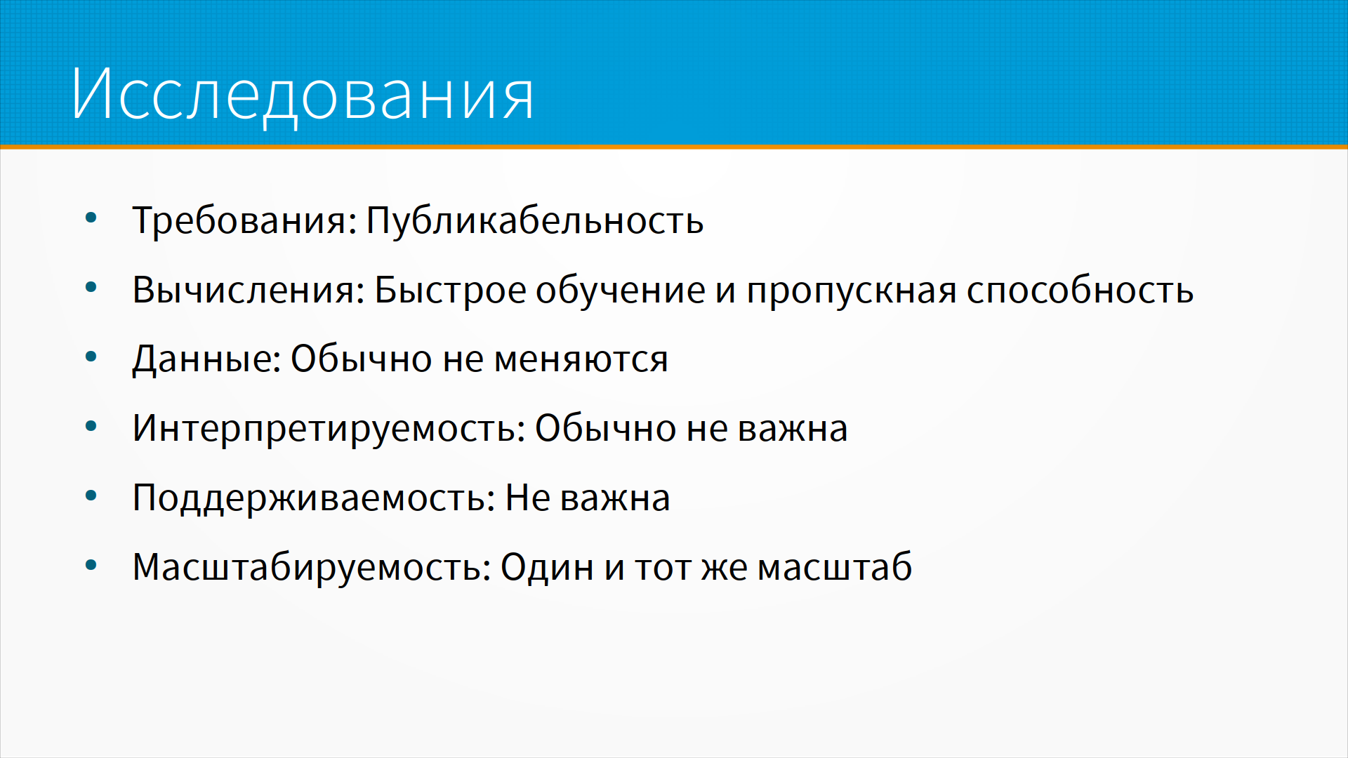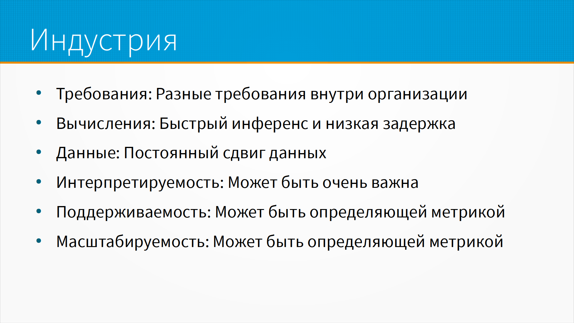 Описанные выше различия в подходах исследователей и индустрии объясняется разными требованиями и ограничениями.