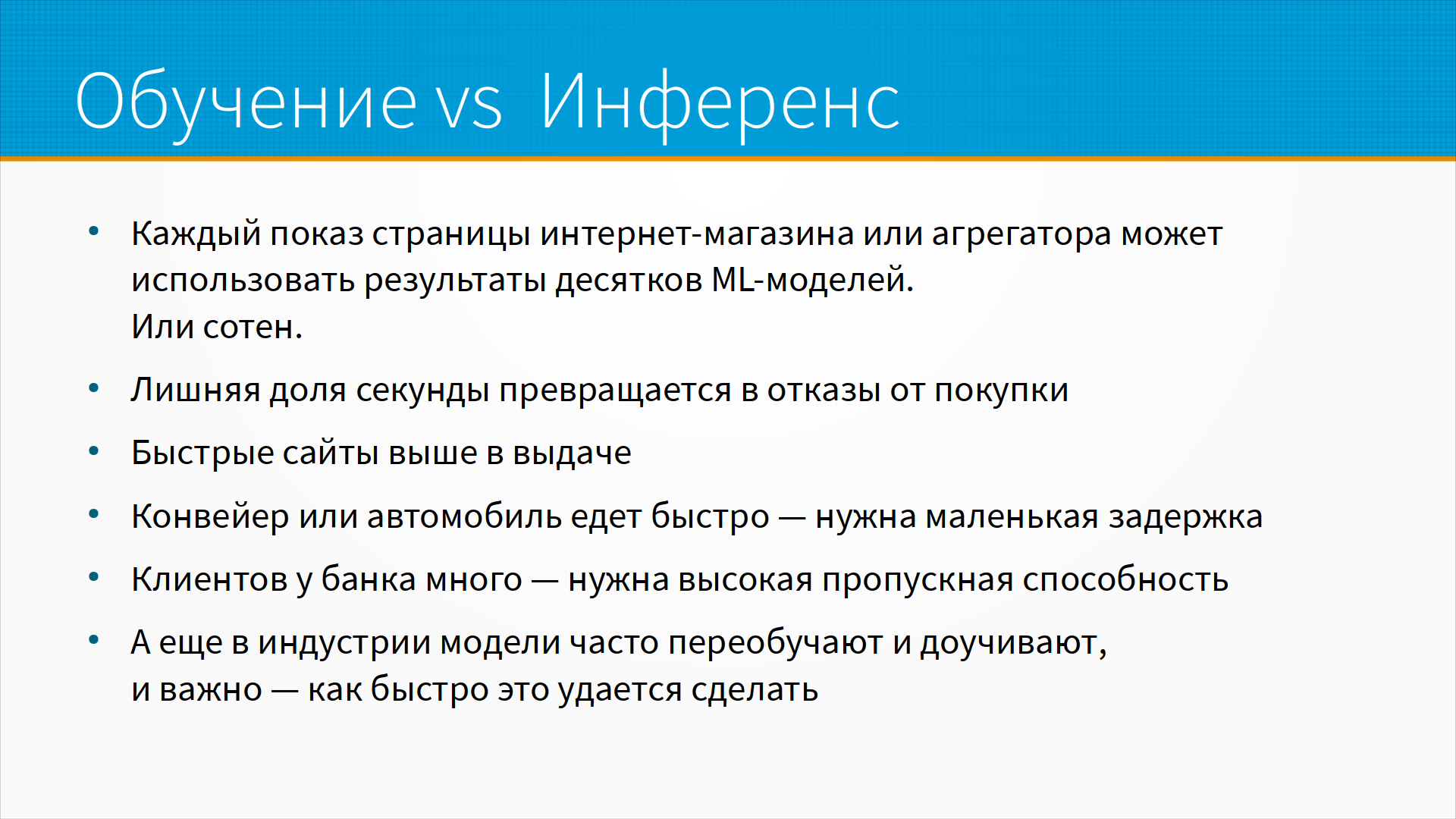 А еще модели часто доучивают на новых данных. Кто-то раз в сутки, а кто-то раз в пятнадцать минут. И хотелось бы, чтобы это тоже было быстро.