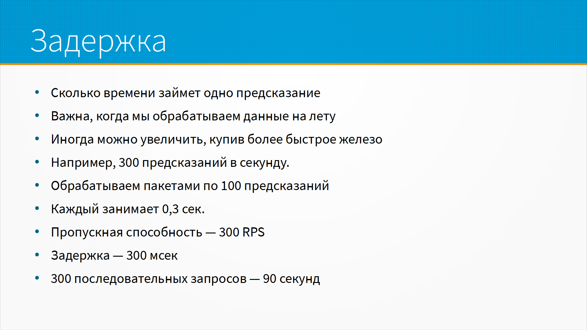 Задержка, или Lаtency - сколько времени занимает обработка одного запроса. Иногда это можно ускорить, купив более быстрое оборудование, но обычно уменьшение задержки требует серьезной переработки модели. Например, квантизации, перехода на вычисления с половинной точностью и так далее. Существуют библиотеки для ускорения работы нейронных сетей - enot, openvine, onnx могут помочь снизить задержку предсказаний.