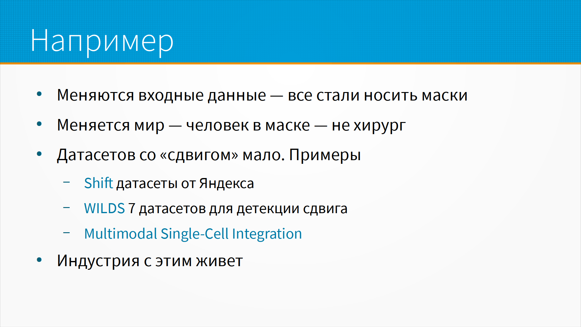 Индустрия все время живет со сдвигом данных. Исследователям не хватало наборов данных с документированным сдвигом, но сейчас они начали появляться: (Shift, WILDS, MMSCI). И я думаю, что в работе со сдвигом данных в ближайшее время произойдет прорыв. А пока надо аккуратно мониторить распределения признаков.