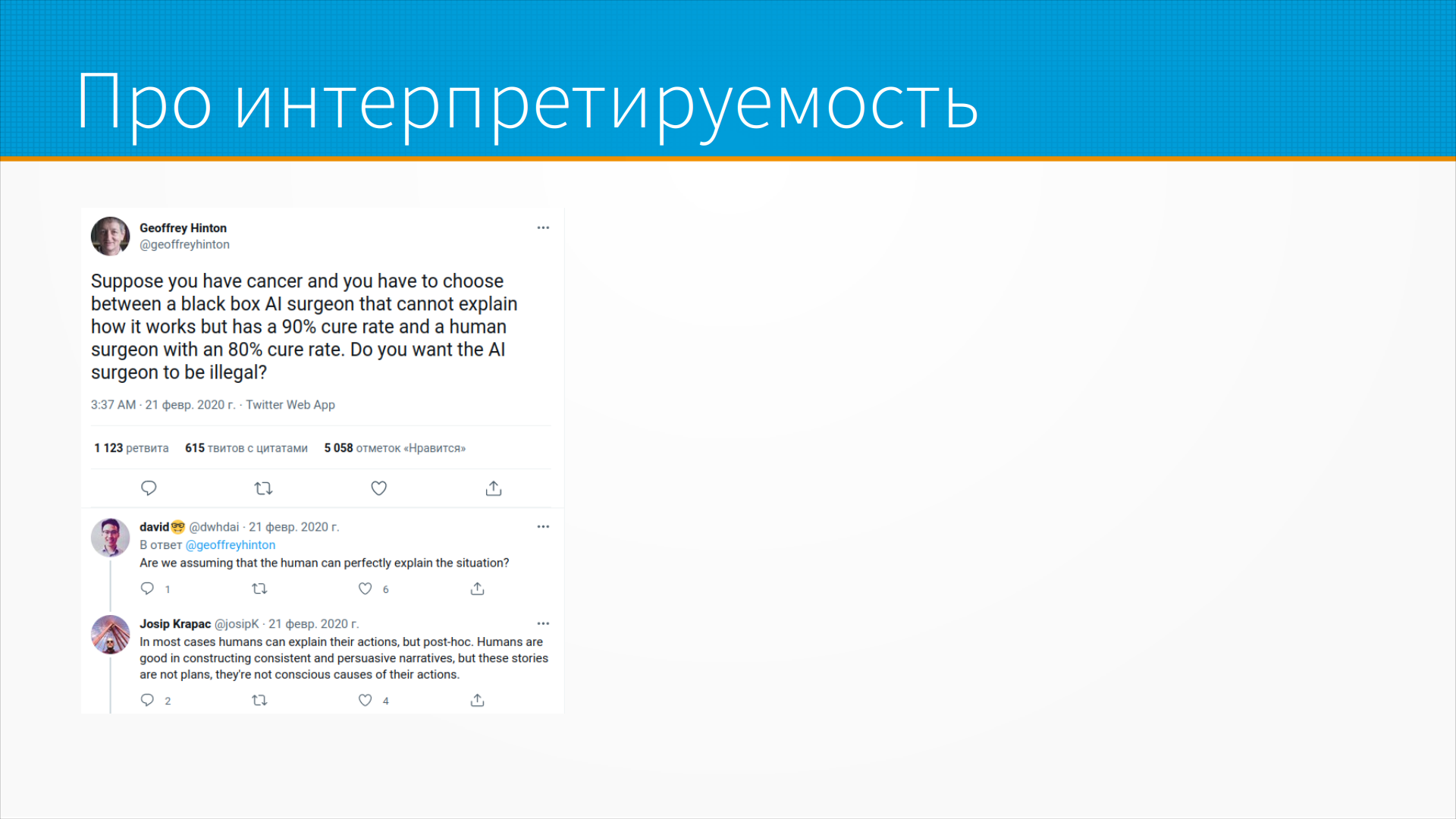 На слайде - скриншот твита Джеффри Хинтона, где он задает провокационный вопрос - что вы выберете: неинтерпретируемого робота-хирурга с вероятностью ошибки 10% или интерпретируемого человека-хирурга с вероятностью ошибки 20%? В комментариях ему подсказывают, что люди обычно придумывают объяснения своим действиям задним числом, и сами в них верят - так что противопоставление это искусственное.