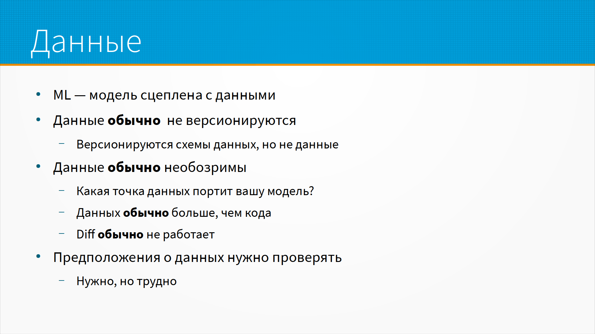 Данные обычно необозримы. Если у нас после изменения кода возникла ошибка, мы можем посмотреть в истории коммитов, что изменилось, и искать ошибку в этом месте. С данными все сложнее. Существуют инструменты для сравнения слепков данных, мониторинга распределений и прочее, но искать изменения в данных гораздо сложнее, чем в коде. К тому же, данных обычно больше, чем кода, намного больше.