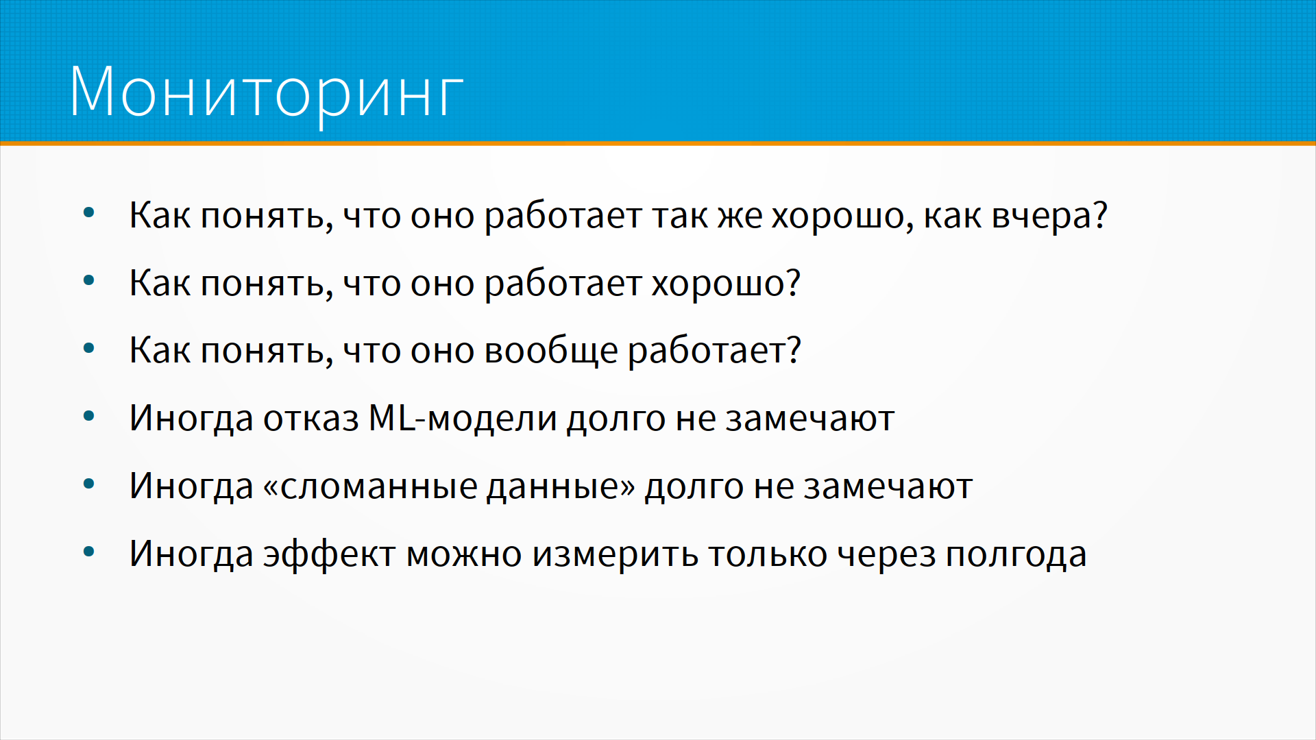 Модель может несколько дней или недель выдавать чушь - и без мониторинга этого никто не заметит. Особенно опасны ситуации, когда мы не можем мгновенно оценить качество работы модели.