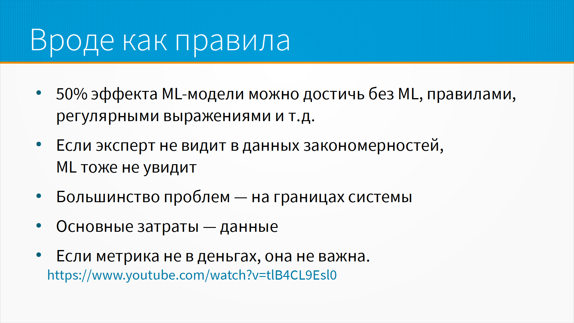 При внедрении модели мы обычно рассчитываем на какой-то эффект. Ускорение работы, снижение затрат и прочее. Примерно половины этого эффекта можно добиться без машинного обучения - простыми правилами. Фильтрацией по списку слов, например, регулярными выражениями, фильтрацией по порогу какого-то значения и т.д.