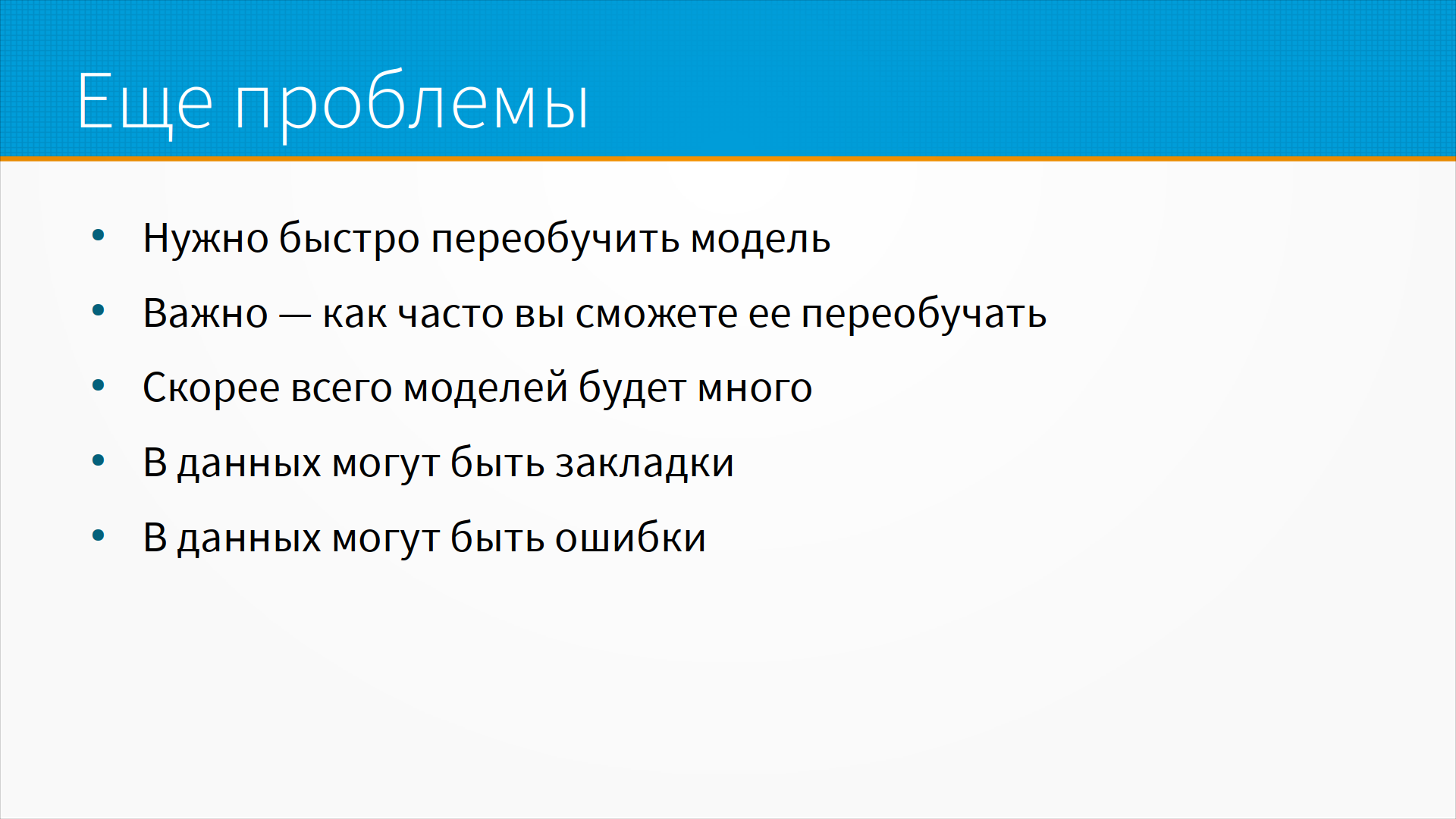Есть еще проблемы - мир меняется, модели нужно переобучать на новых данных, это часто нужно делать быстро,