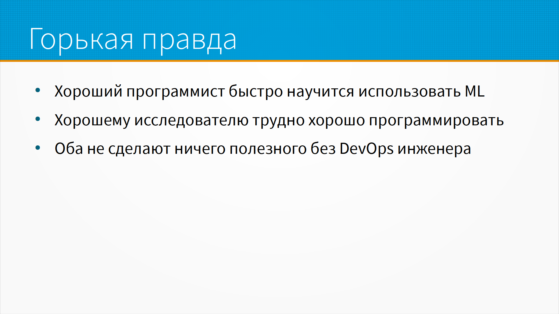 При этом хороший программист может быстро освоить ML-библиотеки, а вот научить ученого писать нормальный промышленный код может быть очень трудно. Но это все неважно, потому что без девопса ни те, ни другие ничего полезного не сделают.