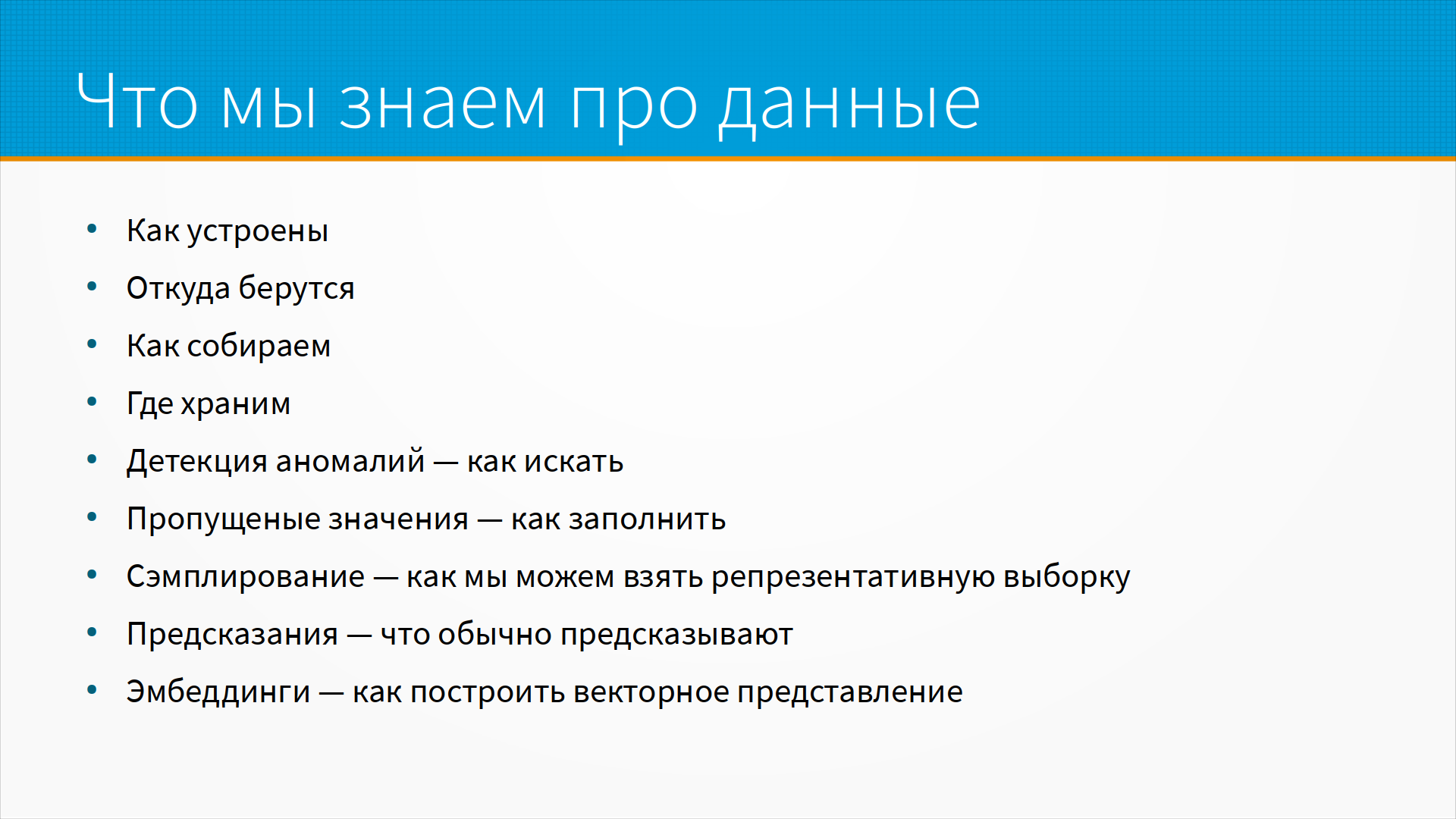 Прежде чем строить какие-то модели, нам нужно понять, с чем мы собственно работаем, то есть что мы знаем про данные. А что мы вообще можем знать про данные? Во-первых, мы можем знать, как они устроены, откуда они берутся, как мы их собираем, то есть какие преобразования, какие-нибудь операции, которые происходят над данными, когда мы их складываем куда-то, где храним, детекция аномалий — как мы находим аномальные значения, как мы заполняем пропущенные значения, как мы можем взять какую-то репрезентативную подвыборку из наших данных, если их слишком много или нам нужно разделить на обучающий и тестовый наборы, что мы можем на них предсказывать, и можем ли мы построить на этих данных векторное представление.